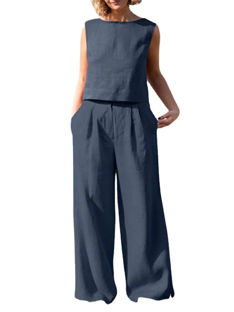 Discover the perfect blend of style and comfort with our European-style cotton and linen two-piece set. This fashionable outfit features a short-sleeve top and long pants, making it an ideal choice for any casual or semi-formal occasion.