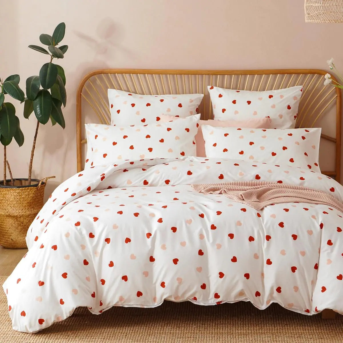 ["Soft and Breathable:Erwinmu Heart Patterned Bedding Duvet Cover Set made of 100% Brushed Microfiber which is ultra softBreathable and Sweat-Absorbent.Whether its the cool summer or the chilly winter you can rely on this Microfiber Comforter Duvet Cover to provide comfort and warmth enhancing the quality of your sleep." Made in Green:This Cute and Soft comforter cover set is Standard 100 by OEKO-TEX certified for meeting the highest testing criteria for harmful chemicals and has been found harmless for humans. Microfiber is easy to recycleand can also biodegrade in natureit is green environmental protection fiber Modern and Unique Design:This comforter cover set With a Fresh pink and white heart printErwinmu Heart duvet cover adds a cute and kawaii touch to your room. It brings a bresth of fresh air and the natural beauty of all seasons to your bedroom decor.Its a Great Christmas Gift / Mother’s Day/Valentine’s Day for your familygirlsmotherand love ones. What\s included:Package including 1 x Queen Duvet Cover 90"x90" + 2 x Pillow Shams 20"x30";NOT INCLUDE Comforter/Duvet/Insert;Super Soft Duvet Cover have hidden zipper closure make sure the duvet cover close completely.this queen size duvet cover securely holds your comforter or duvet insert in place for ultimate comfort.It protects your comforter from dirt and tearsensuring long-lasting use Easy to Care:This microfiber duvet Cover is Machine washablePlease wash separately in cold water(Recommended water temperature below 40 degrees) gentle cycletumble dry on low or dry naturallydo not bleachIf you have any questionsplease feel free to contact us!]