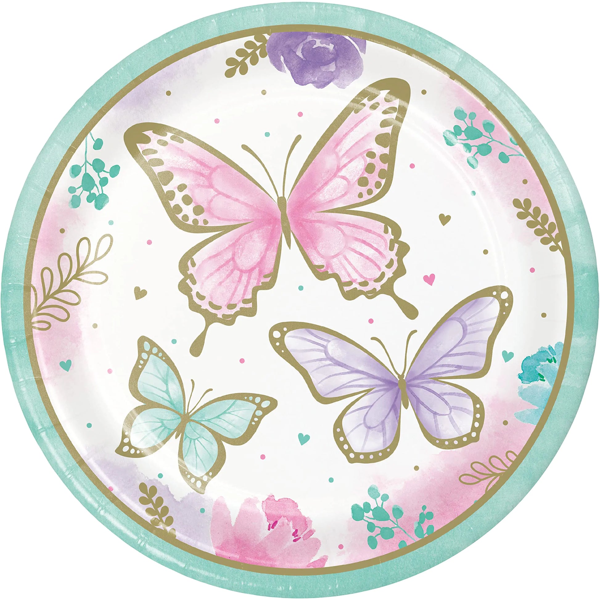 Invite guests to flutter over and celebrate the special occasion with help from our Golden Butterfly Paper Plates. These gorgeous paper plates feature a dreamy design of butterflies flowers leaves and hearts in pastel hues and metallic gold foil touches. The sturdy plates measure 9 inches round a perfect size for serving delicate delicious party fare. These paper plates are sold eight plates per package and theyre perfectly complemented by the other items in our Golden Butterfly collection. Select these plates and start planning your beautiful gathering!