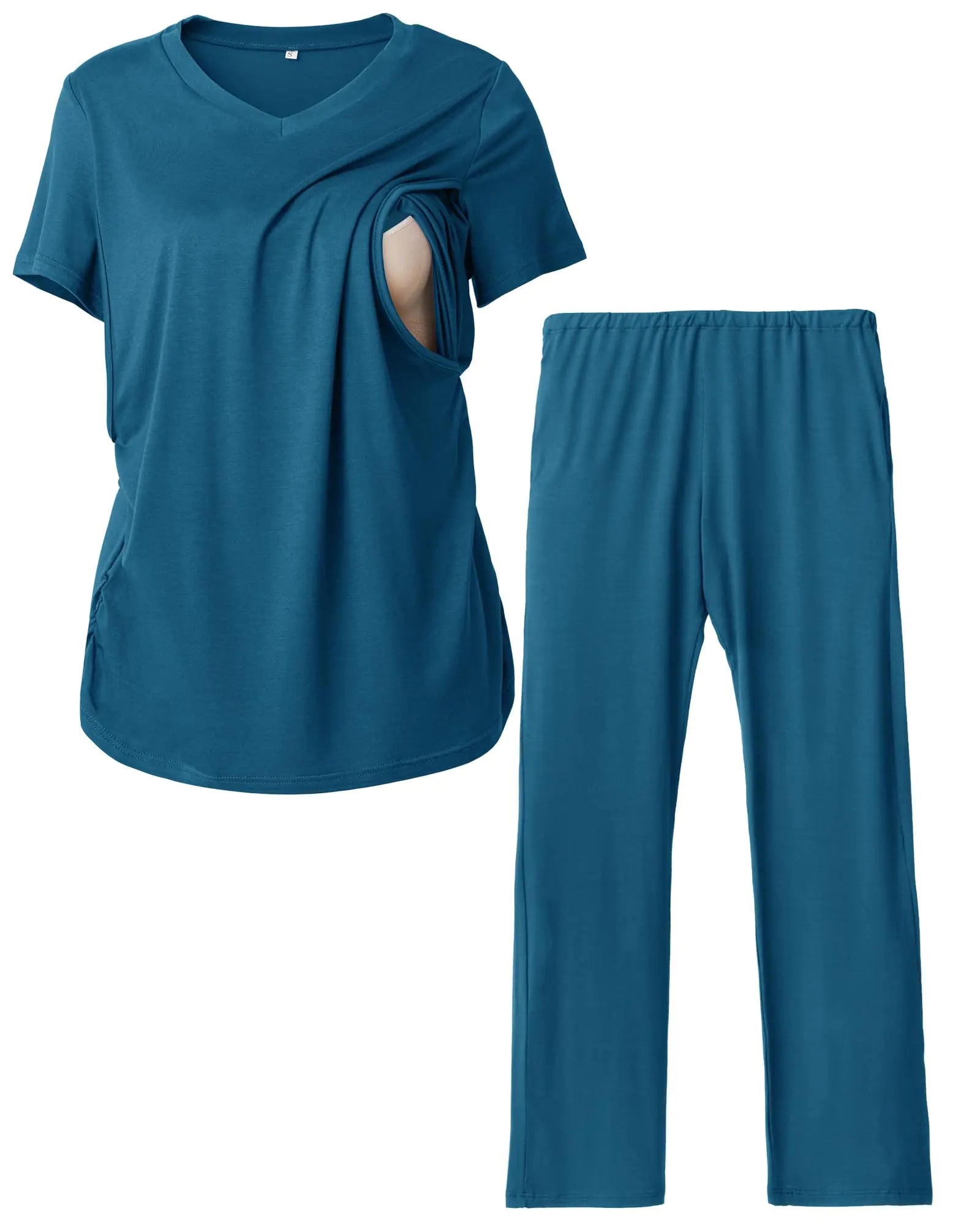 [PRODUCT INCLUDED:The V neck nursing pajamas set includes 1 piece short sleeve nursing top+1 piece long pantsthis 2-pieces breastfeeding pjs set is tailored for expectant mothers and new moms. TOP FEATURES:Our nursing pjs top features a convenient sides-open design for effortless breastfeedingsay goodbye to fumbling with claspshooksor zippersespecially during late-night feeds. PANT FEATURES:High-waisted postpartum pajamas pants with adjustable waistband are suitable for pregnancy and postpartum wearduring pregnancythe waistband can be adjusted according to the size of the abdomen to reduce the discomfort caused by tightness; Postpartumthe position of the waistband can be adjusted to avoid friction with the wound;And the pants have two side pockets for small items. OCCASION:The postpartum pjs set crafted from softcomfortable materialsthese nursing pajamas cater to various stages during pregnancy postpartumor for daily and sleepweara versatile choice for new moms. IDEAL CLOTHES FOR PREGNANCY:Our maternity postpartum breastfeeding pajamas set is an excellent clothes for yourself your spouse relatives or friends. Suitable for different seasons versatile combinations to match varying temperatures with the pants and shorts.]