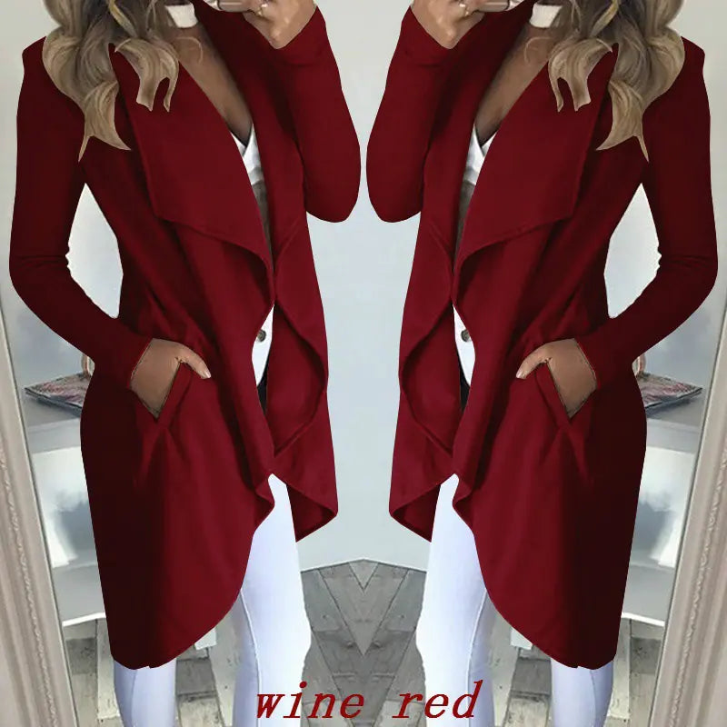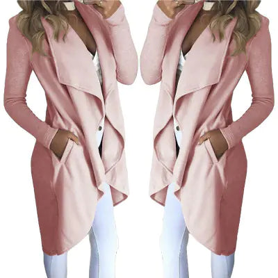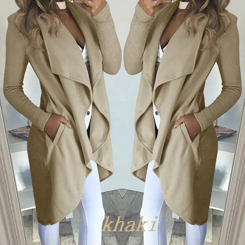 This coat is designed without a belt, allowing for a clean, polished look while the unique irregular splicing adds a touch of modern flair. Whether you're headed to work, out for brunch, or enjoying a night on the town, this trench coat is your go-to outerwear piece.