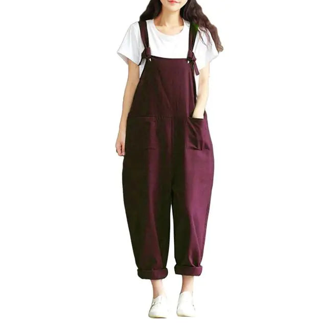 Womens Sleeveless Solid Color Dungarees Jumpsuits 5XL